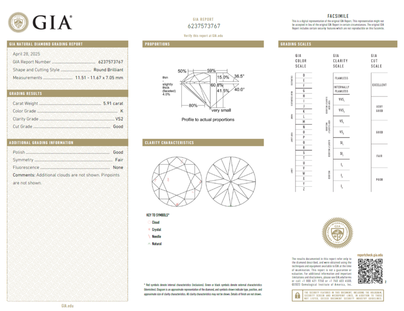 GIA, 2025, Report No. 6237573767, 5.91 carats, K color, VS2 clarity, No fluorescence