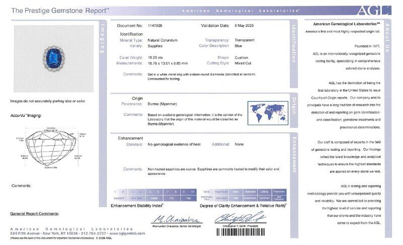 AGL, 2025, Report No. 1147905, Natural Corundum, Sapphire, Burma (Myanmar), No gemological evidence of heat