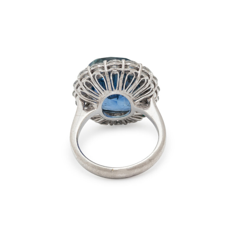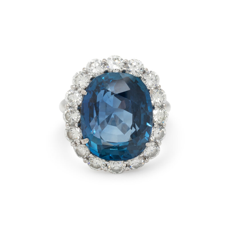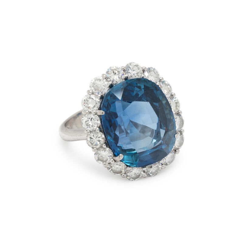 Centering a cushion mixed cut sapphire weighing approximately 19.25 carats by formula, surrounded by round diamonds weighing approximately 2.20 carats total. Mounted in platinum. Ring size 6 3/4.