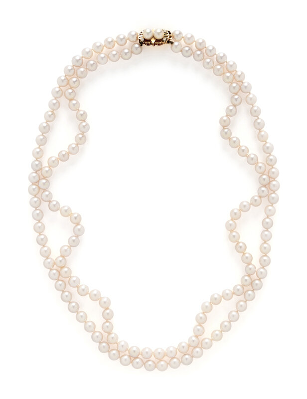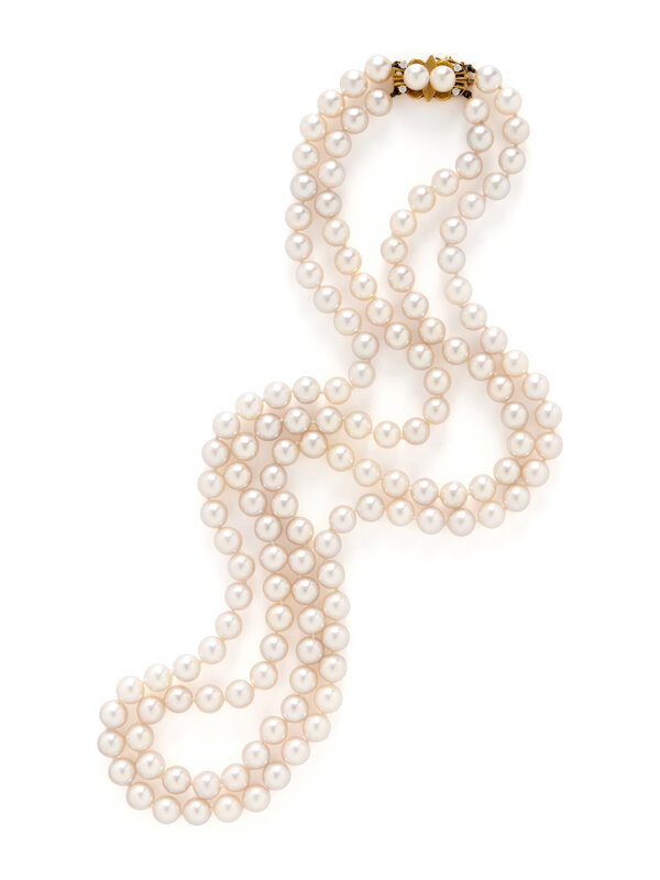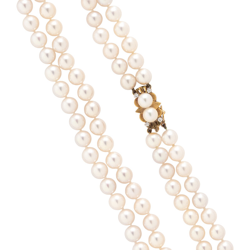 Designed as two strands of cultured pearls measuring approximately 7.50 - 7.95 mm, with a 14 karat yellow gold clasp set with two cultured pearls measuring approximately 7.00 mm and round diamond accents. 23 1/2 inches long.