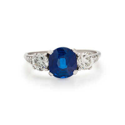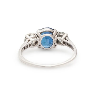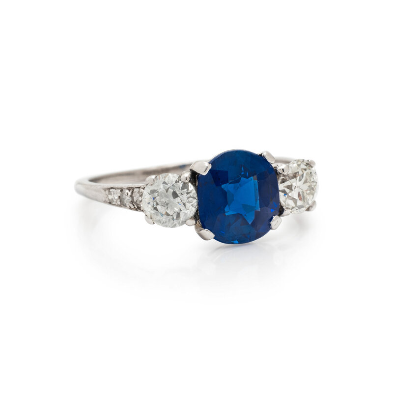 Set with an oval mixed cut sapphire weighing approximately 2.35 carats, flanked by old European cut diamonds weighing approximately 0.80 carat total, with single cut diamonds accenting the shank. Mounted in platinum. Ring size 8 1/2.