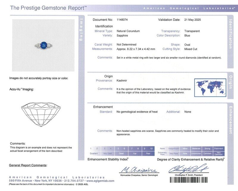 AGL, 2025, Report No. 1148074, Natural Corundum, Sapphire, Kashmir, No gemological evidence of heat