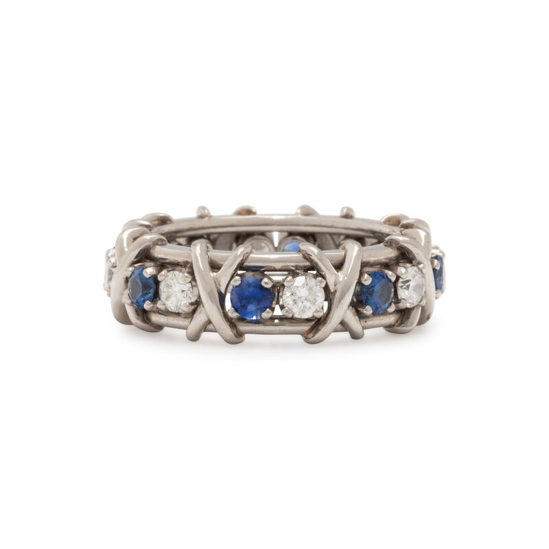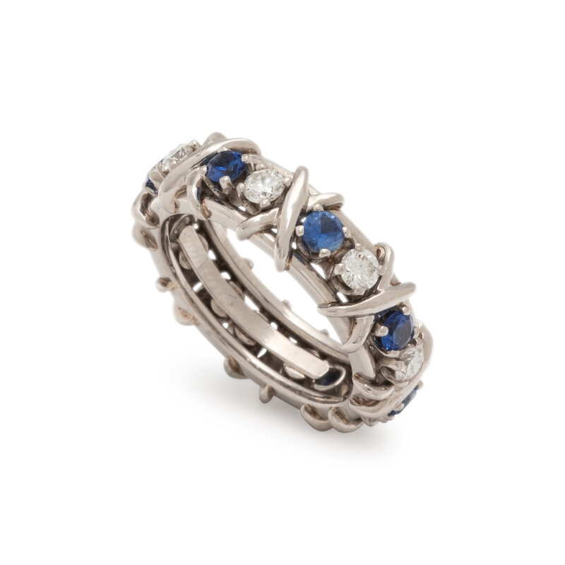 Round diamonds and sapphires interspersed with 'X' motifs. Mounted in platinum. Ring size 6.