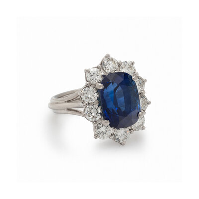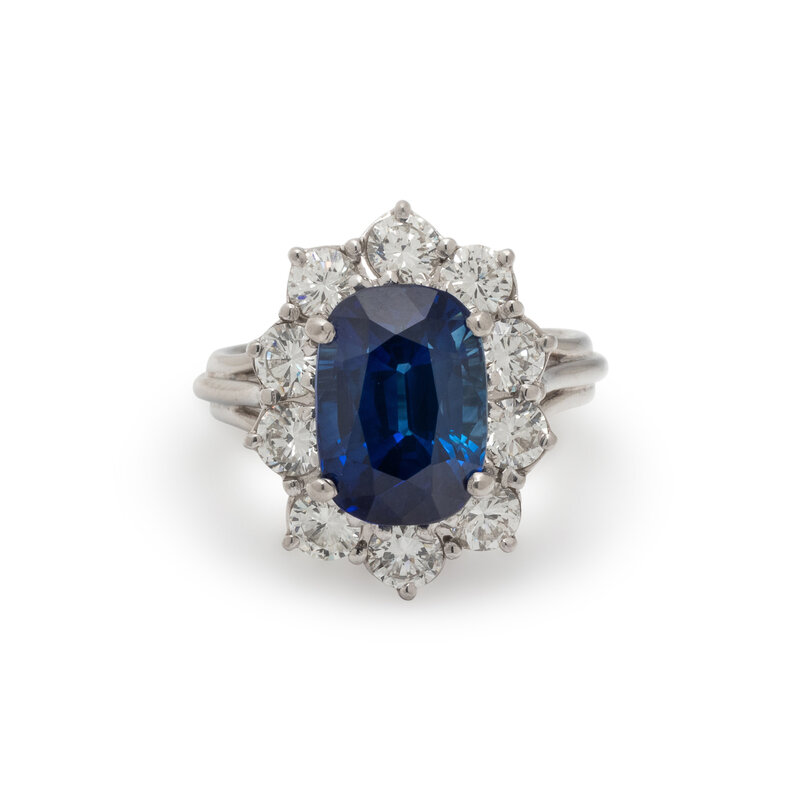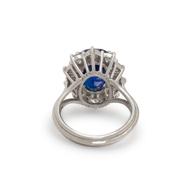 Featuring a cushion mixed cut sapphire weighing approximately 6.20 carats by formula, surrounded by a halo of round diamonds weighing approximately 1.60 carats total. Mounted in platinum. Ring size 5 1/4.