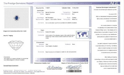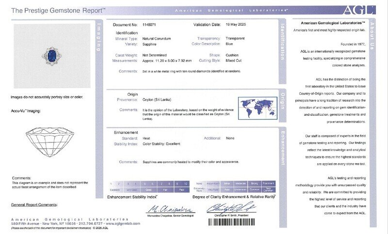 AGL, 2025, Report No. 1148071, Natural Corundum, Sapphire, Ceylon (Sri Lanka), Heated
