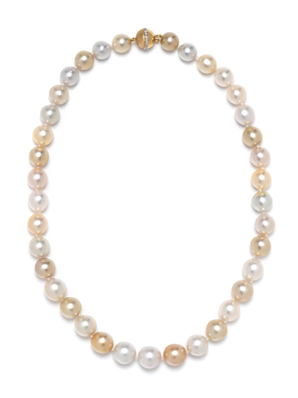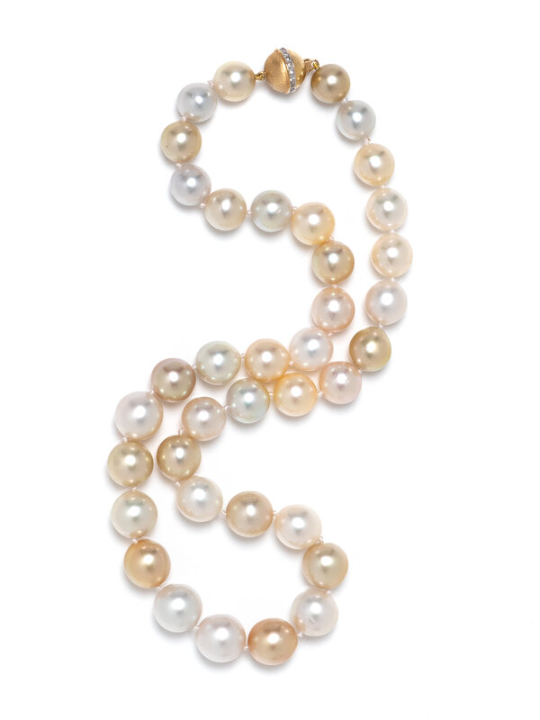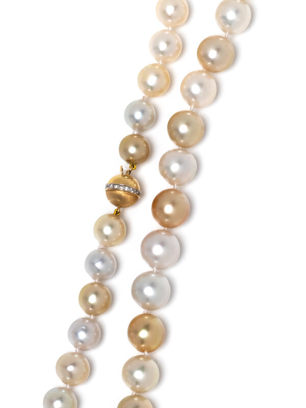 Including multicolor cultured white and golden pearls (origin of color not tested) measuring approximately 10.10 - 12.50 mm, completed by an 18 karat yellow gold ball clasp set with a row of round diamonds. 18 3/4 inches long.