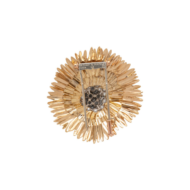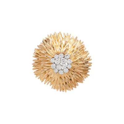 Centering a cluster of round diamonds weighing approximately 1.75 carats total, with radiating yellow gold petals. 18 karat yellow gold and platinum. 1 1/2 inches wide.