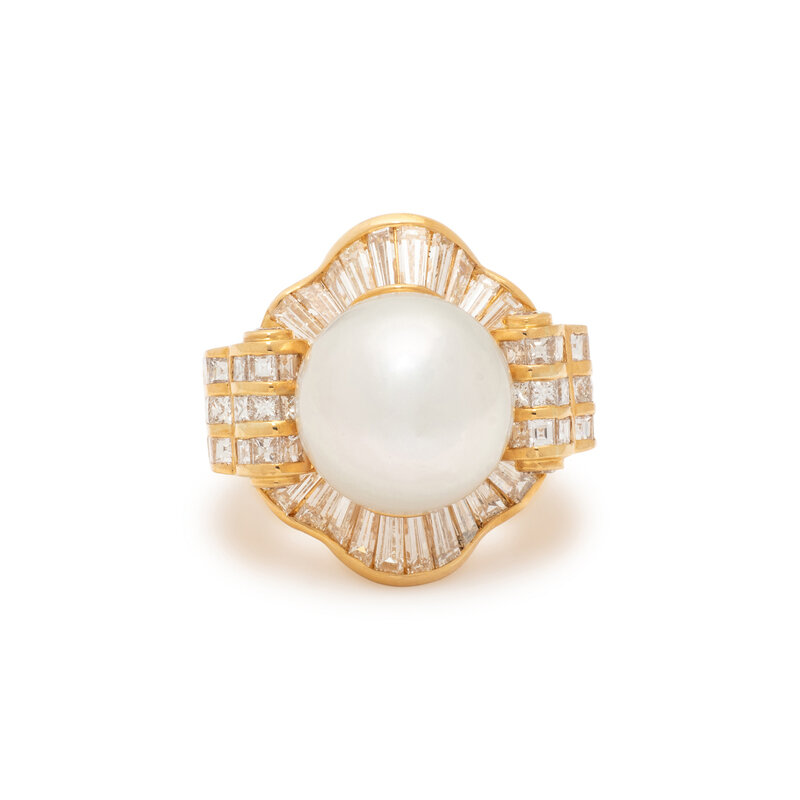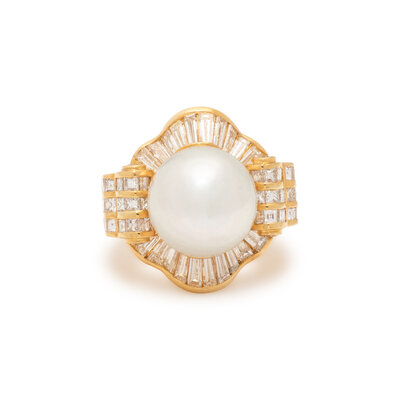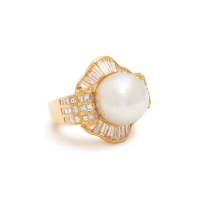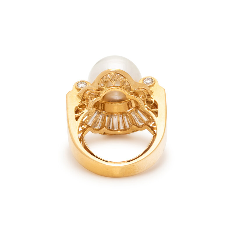 Featuring a cultured pearl measuring approximately 13.00 mm, surrounded by baguette, princess, and square step cut diamonds weighing approximately 3.00 carats total. Mounted in 18 karat yellow gold. Ring size 6 3/4.