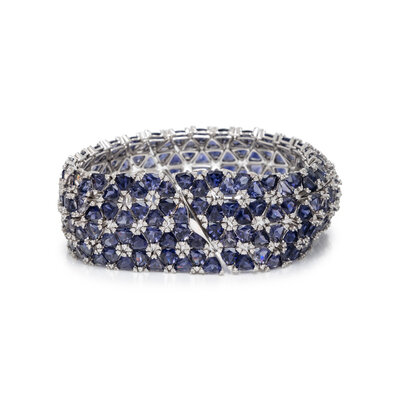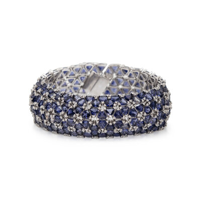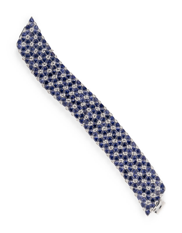 The flexible strap set with triangular iolites weighing approximately 45.00 - 50.00 carats total, accented by clusters of round diamonds weighing approximately 3.25 carats total. Mounted in 18 karat white gold. 7 3/4 inches long, 1 inch wide.
