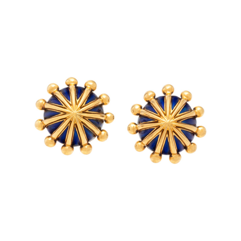 In a radiating design with blue enamel. 18 karat yellow gold. 3/4 inch wide.