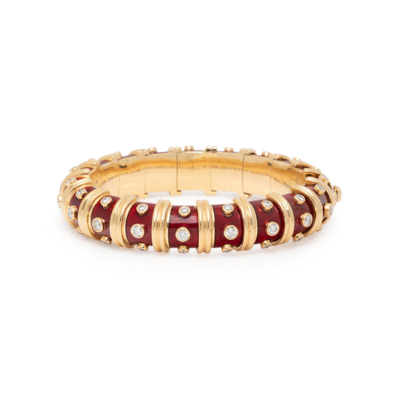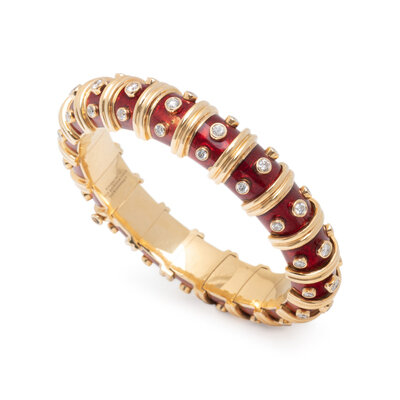Designed as a semi-flexible bangle of deep red paillonné enameled sections studded with round diamonds weighing approximately 3.50 carats total, alternating with fluted yellow gold motifs. Mounted in 18 karat yellow gold. 6 1/4 inches inner circumference, 10.00-12.00 mm wide.