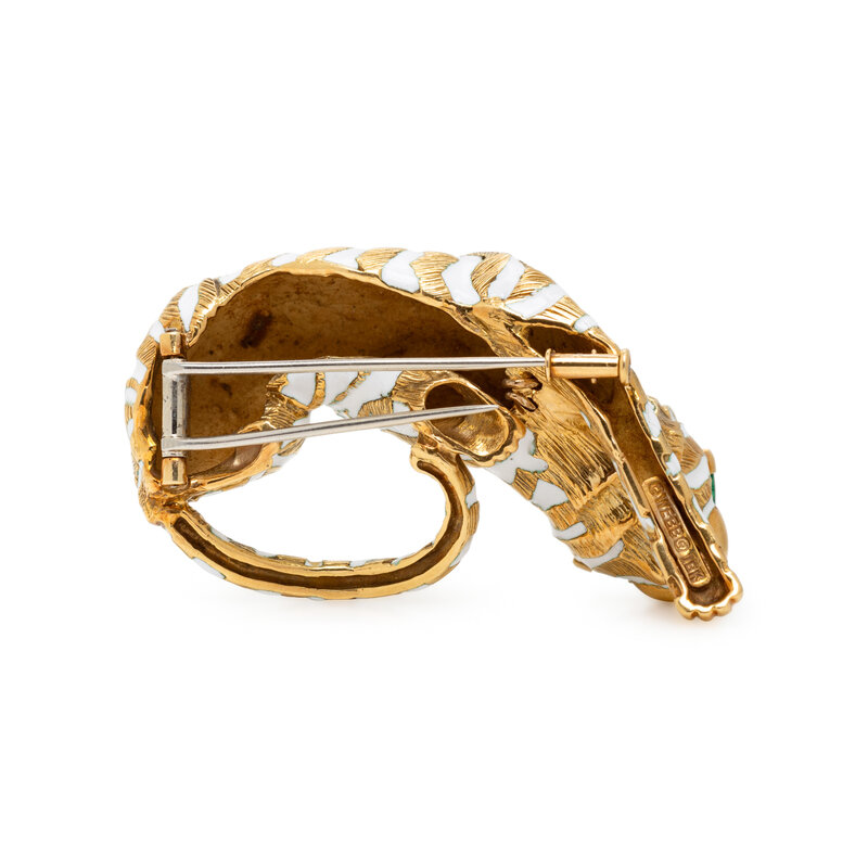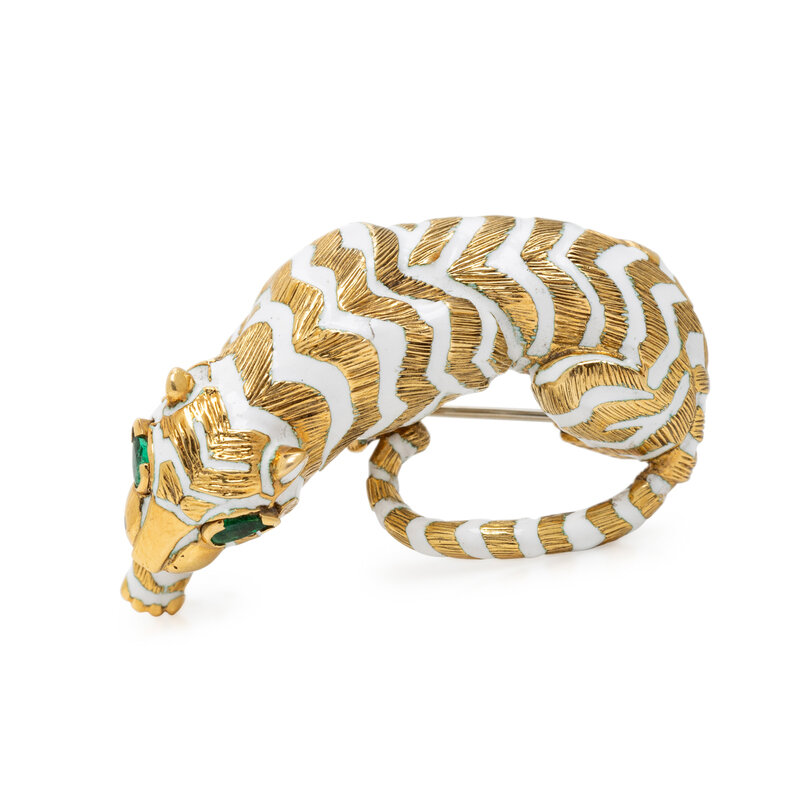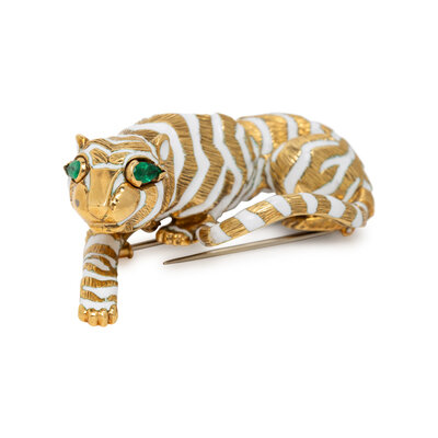 The lounging tiger with pear shaped emerald eyes and white enamel stripes. Mounted in 18 karat yellow gold. 2 x 1 1/4 inches.