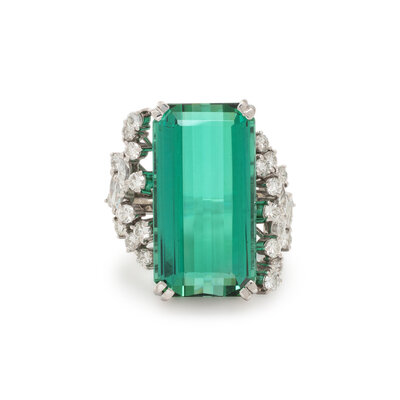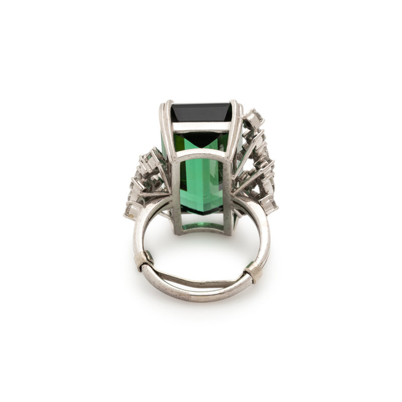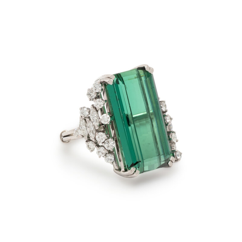 Set with a rectangular green tourmaline measuring approximately 23.35 x 12.50 x 8.45 mm, and round and marquise cut diamonds weighing approximately 1.50 carats total. Mounted in white gold. Ring size 7.