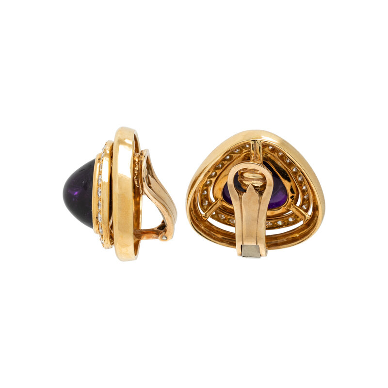 Triangular cabochon amethyst measuring approximately 15.40 x 13.70 x 9.00 mm, surrounded by round diamonds weighing approximately 2.00 carats total. Mounted in yellow gold. 1 inch long.