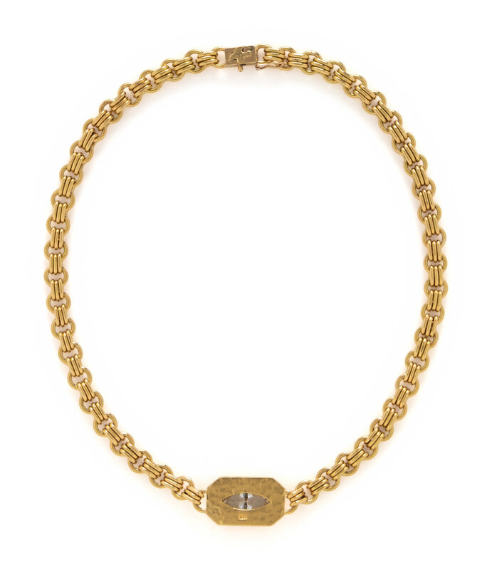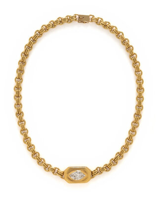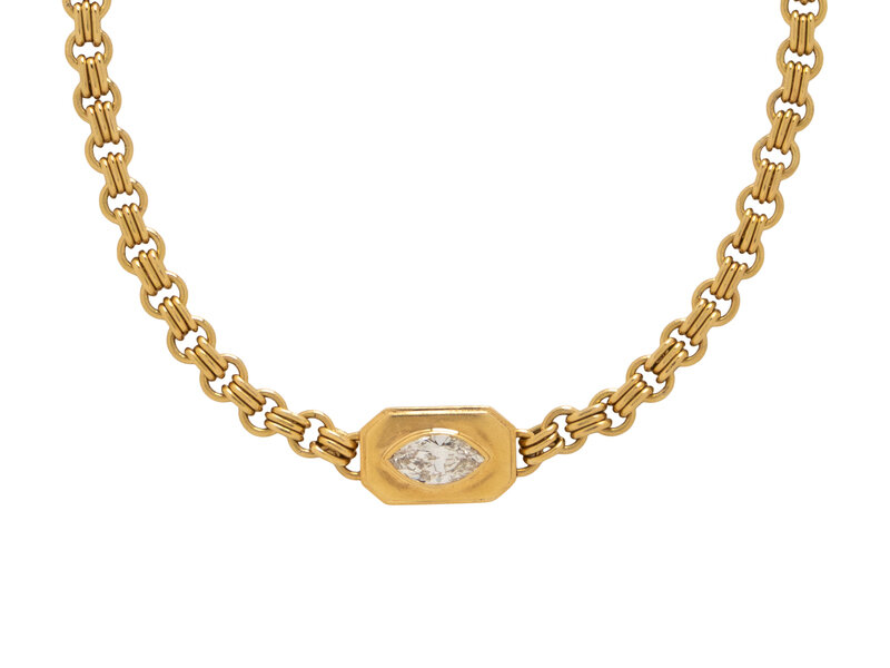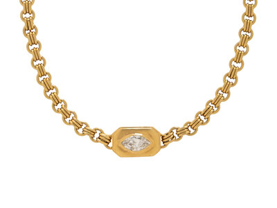 Fancy link collar necklace with an elongated octagonal marquise brilliant cut diamond weighing 2.02 carats. Mounted in yellow gold. 13 3/4 inches long.
