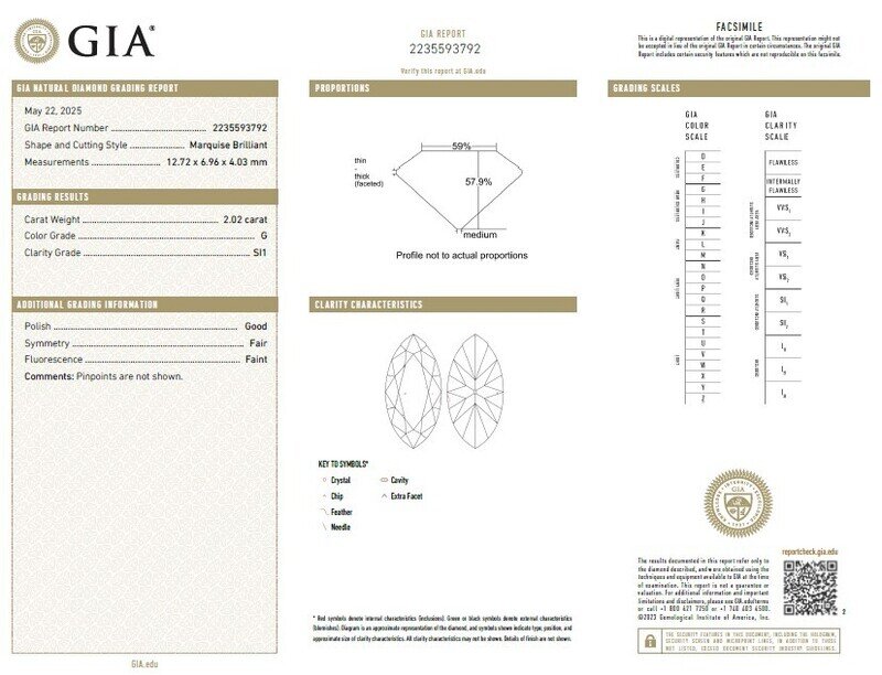 GIA, 2025, Report No. 2235593792, 2.02 carats, G color, SI1 clarity, Faint fluorescence