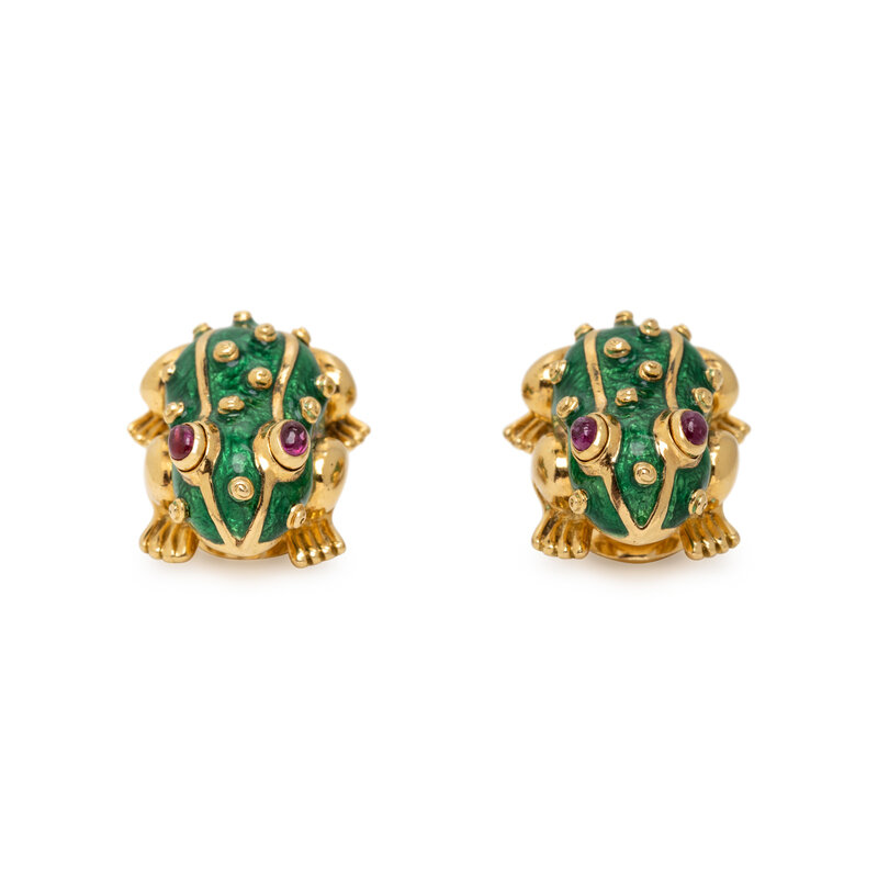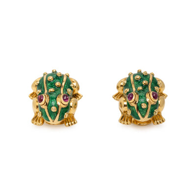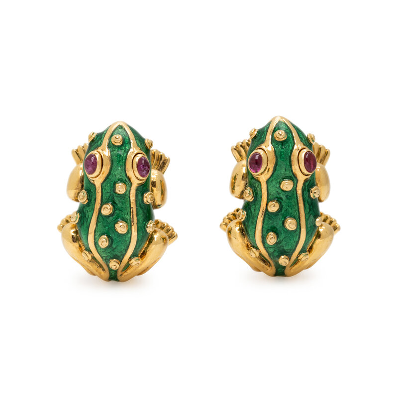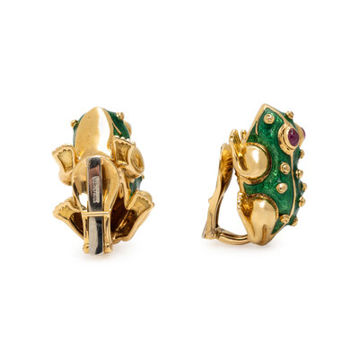 DAVID WEBB, RUBY, ENAMEL, AND YELLOW GOLD FROG EARRINGS