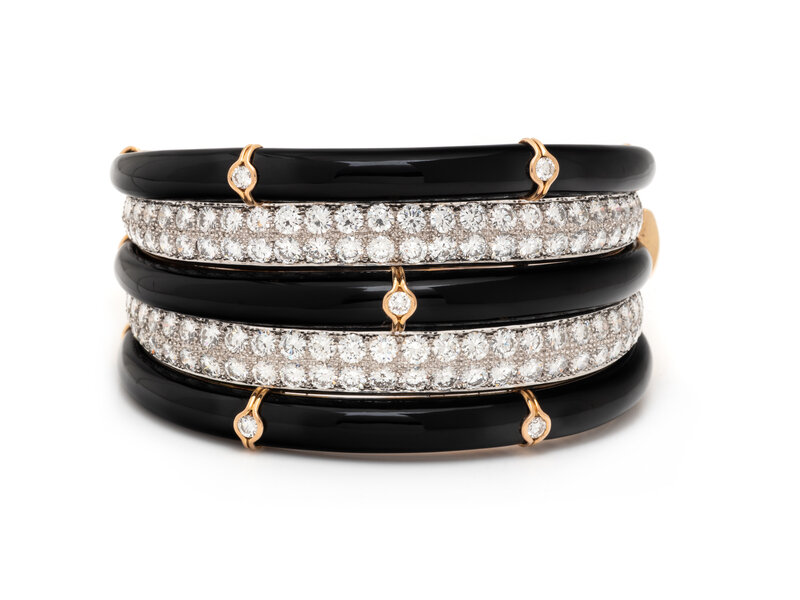 Designed as a tapering bangle of three rows of black onyx and yellow gold accented with collet set round diamonds, spaced by two pavé set round diamond and white gold rows, the diamonds weighing approximately 10.00 - 12.00 carats total, hinged with side clasp. 7 1/4 inches inner circumference, 20.00 - 40.00 mm wide.