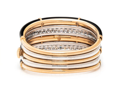 DIAMOND, BLACK ONYX, AND BICOLOR GOLD BANGLE BRACELET