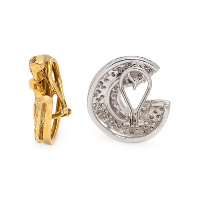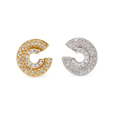 'C' shaped design, set with round diamonds weighing approximately 4.50 - 5.00 carats total. Mounted in yellow and white gold. 1 inch long.