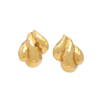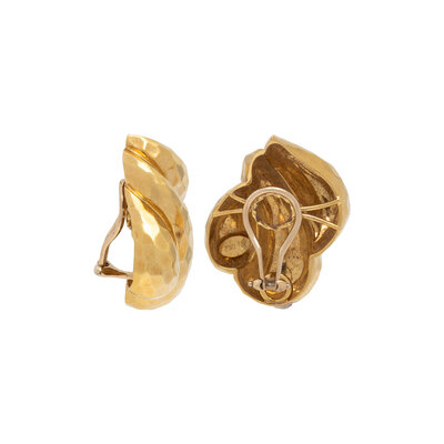 Sculptural design with hammered finish. 18 karat yellow gold. 1 1/4 inches long.