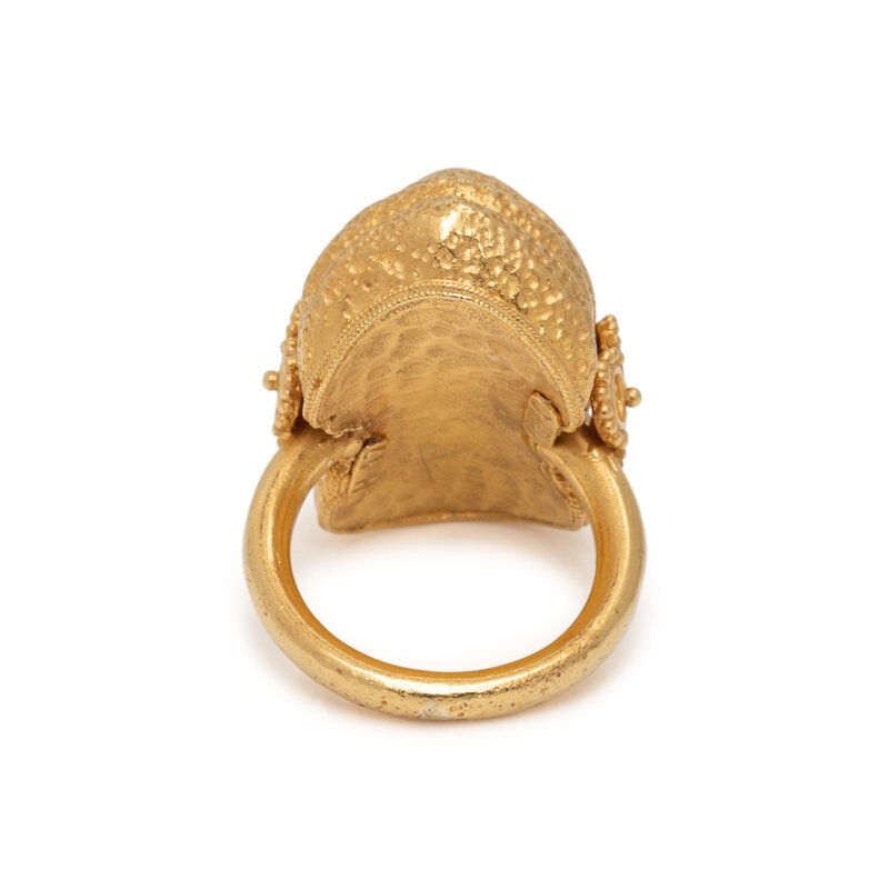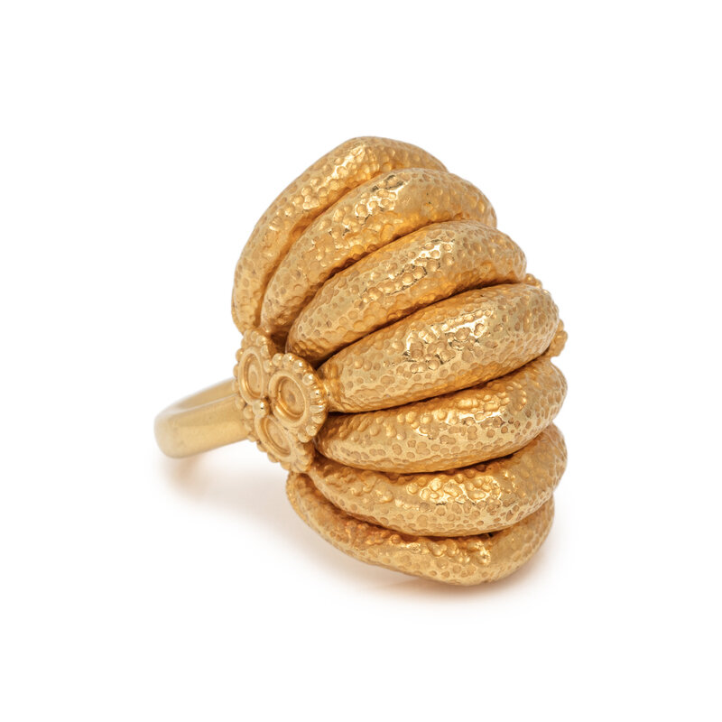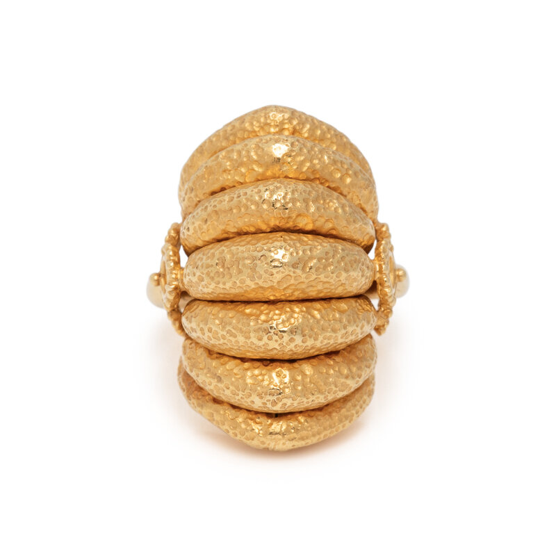 Greco-Roman style, ribbed hammered gold. 18 karat yellow gold. Ring size 5 1/4.