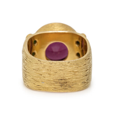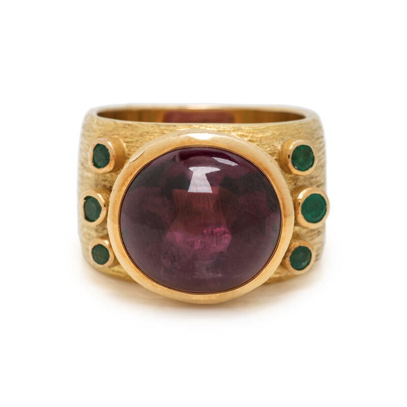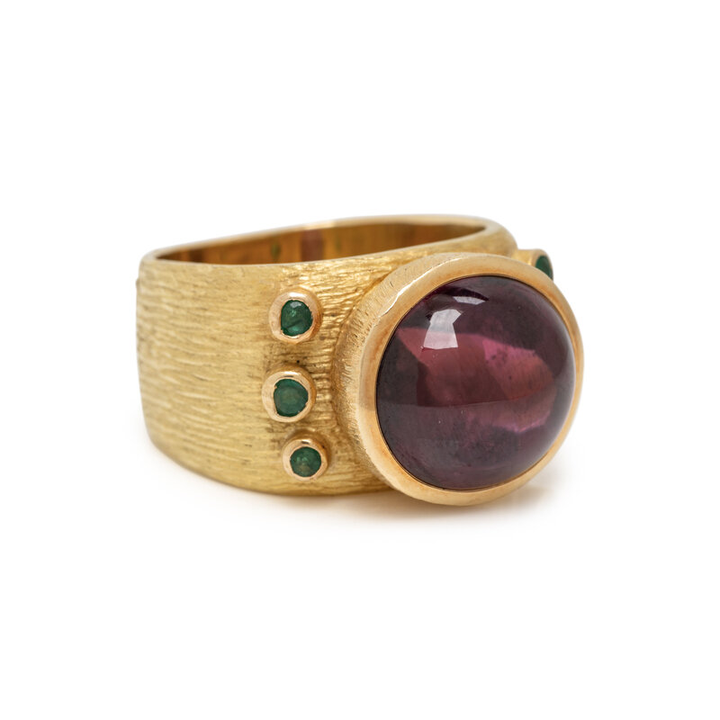 GRIMA, YELLOW GOLD, GARNET, AND EMERALD RING