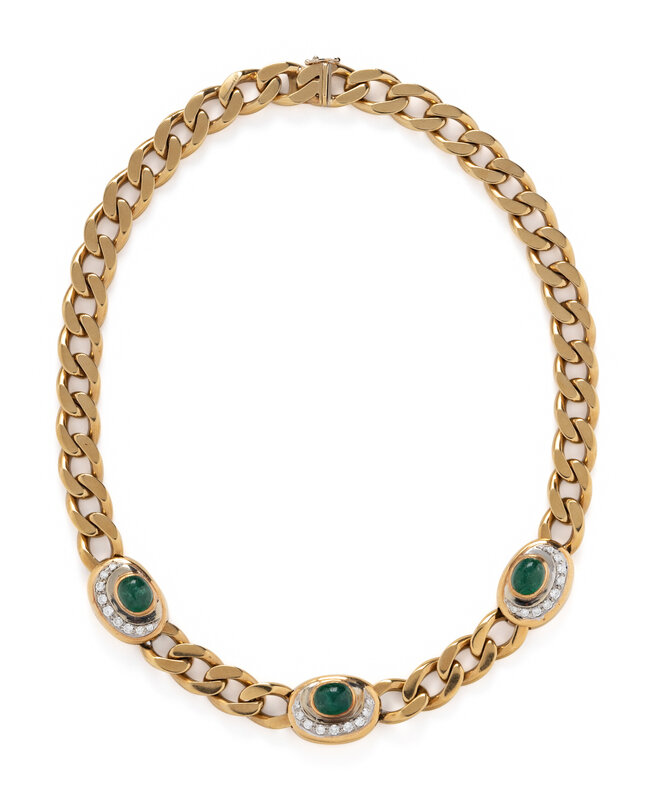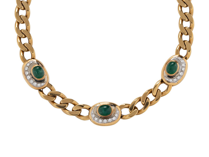The curb link chain set with three oval cabochon emeralds each measuring approximately 8.50 x 6.90 mm, with round diamond crescent detail, weighing approximately 0.75 carat total. Mounted in 18 karat yellow gold. 16 1/4 inches long.