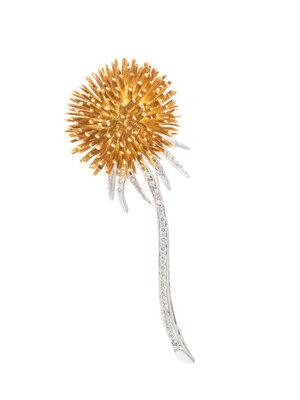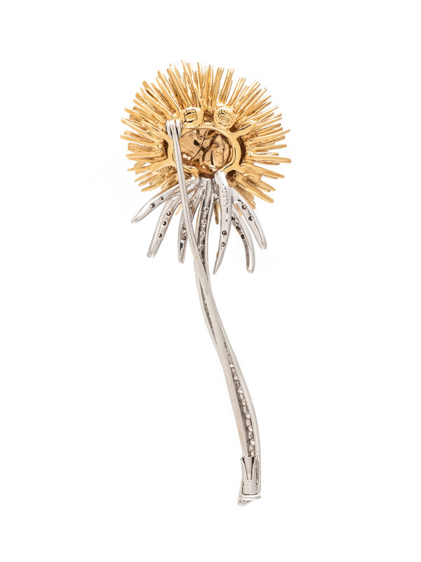 Designed as a yellow gold dandelion with round diamond and white gold bracts and stem. 18 karat yellow and white gold. 2 1/2 inches x 1 inch.