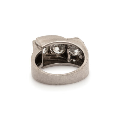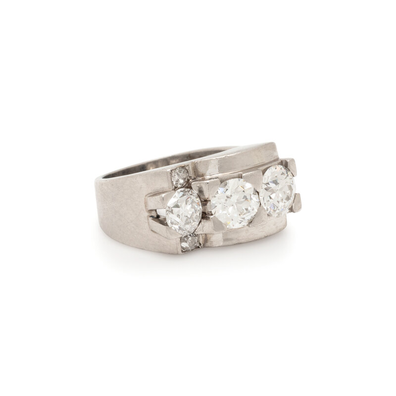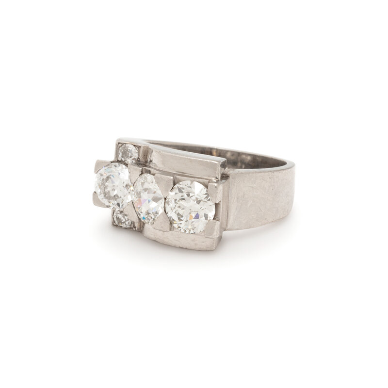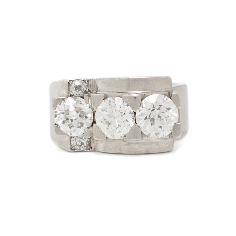 Set with three old European cut diamonds weighing approximately 2.70 - 3.00 carats total, with two old European cut diamonds weighing approximately 0.10 carat total. Mounted in platinum. Ring size 7.