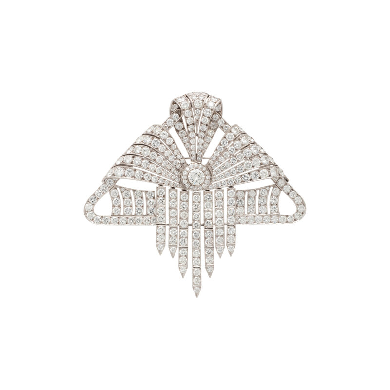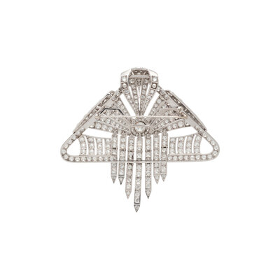 Of triangular geometric design, set with a round diamond weighing approximately 1.00 carat, suspending articulated fringe. Round diamonds set throughout weighing approximately 20.00 - 22.00 carats total, with a detachable pin on the back so the piece can also be worn as a pendant. Mounted in platinum. 3 1/2 x 3 1/4 inches.