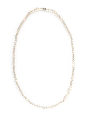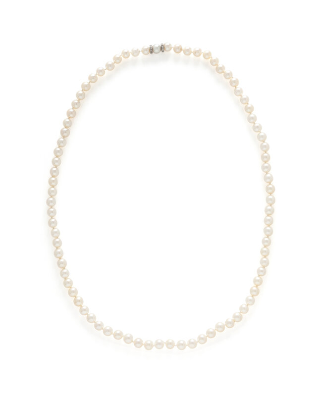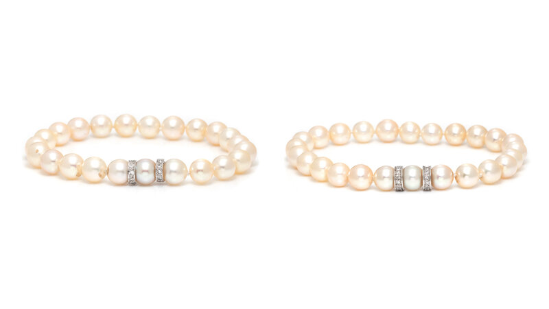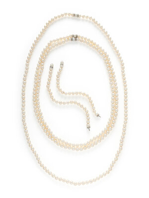 Designed as three nesting cultured pearl necklaces and two bracelets, each with a white gold and single cut diamond rondelle and cultured pearl clasp. Cultured pearls measuring approximately 8.5 to 9 mm. Necklaces: 29 1/2, 31 1/2, and 44 inches long. Bracelets: 8 1/4 and 9 1/4 inches long.