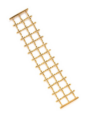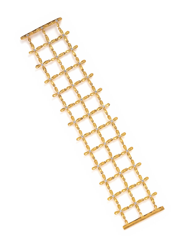 Flower motif links in a lattice design, set with round diamonds weighing approximately 1.15 carats total. Mounted in 18 karat yellow gold. 7 1/2 inches long, 1 5/8 inches wide.