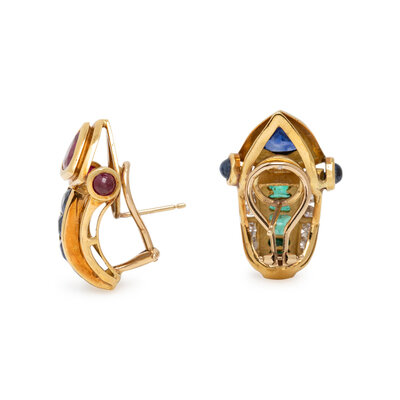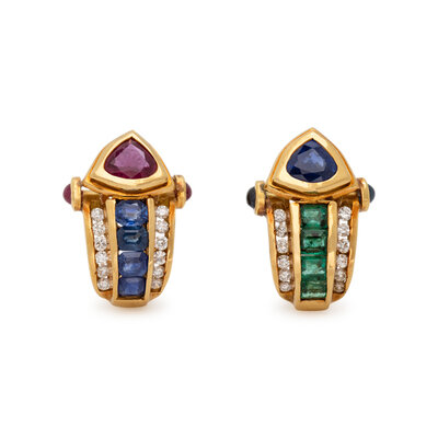 RUBY, SAPPHIRE, EMERALD, AND DIAMOND EARRINGS