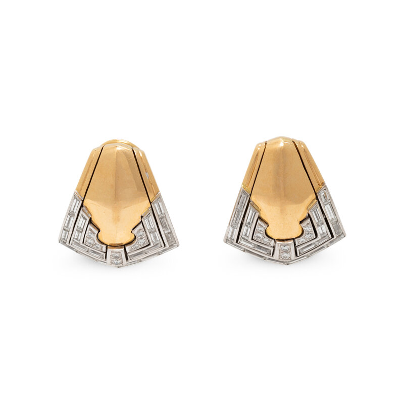 In a geometric style, set with round and baguette cut diamonds weighing approximately 1.90 carats total. Mounted in 18 karat yellow and white gold. 15/16 inch long.