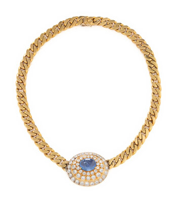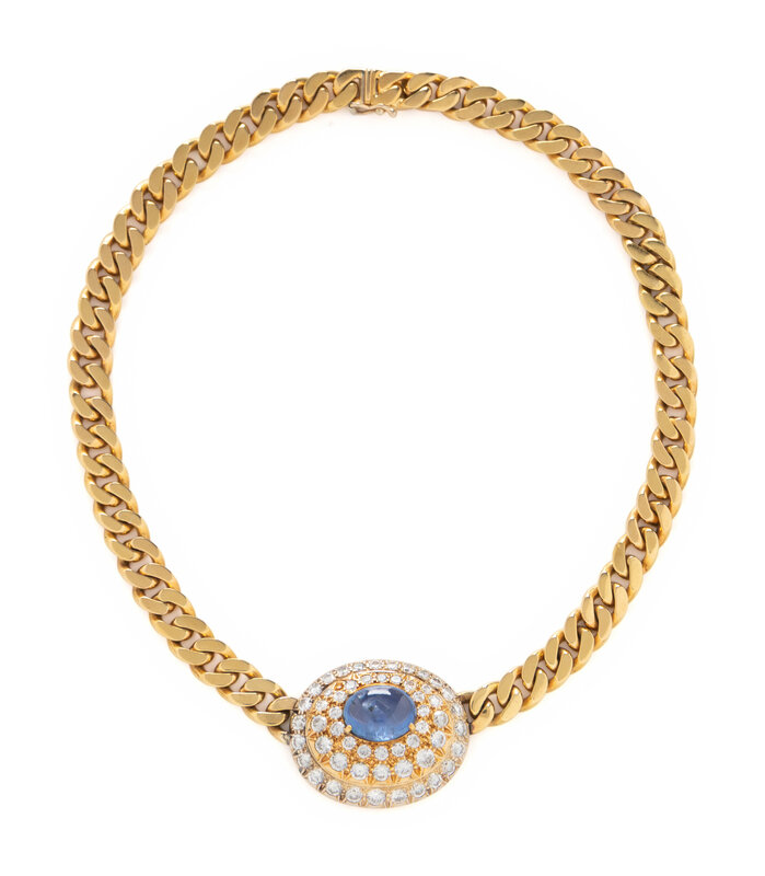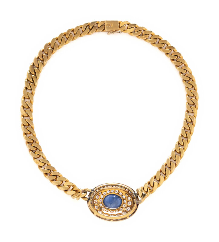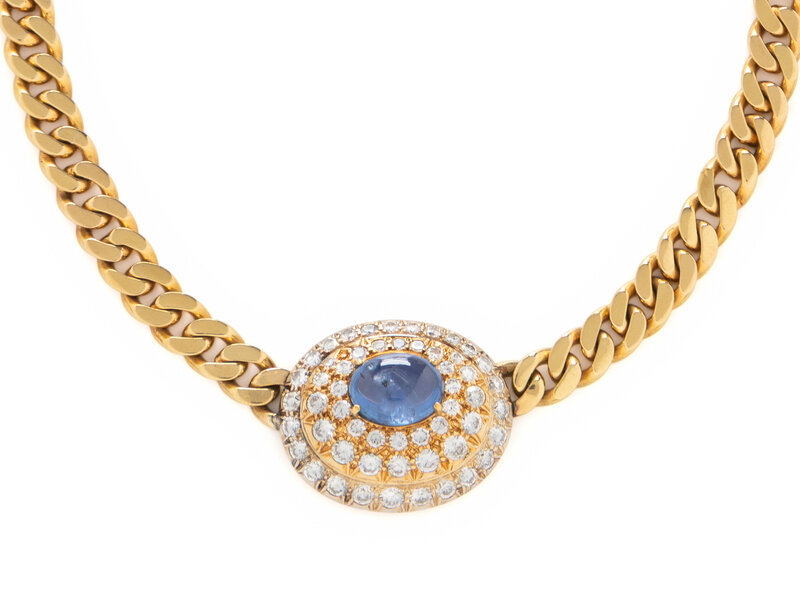 A bicolor gold pendant set with one oval cabochon sapphire weighing approximately 8.00 carats by formula, and round diamonds weighing approximately 4.00 - 5.00 carats total, suspended from a curb link chain. 18 karat yellow and white gold. 13 1/2 inches long.