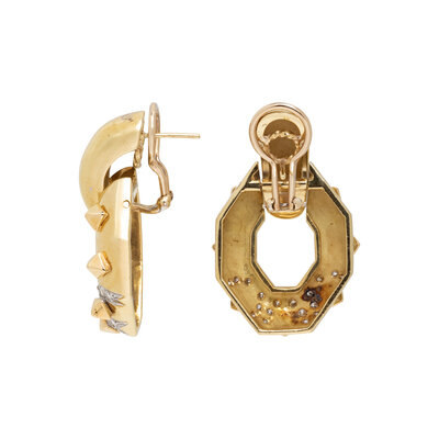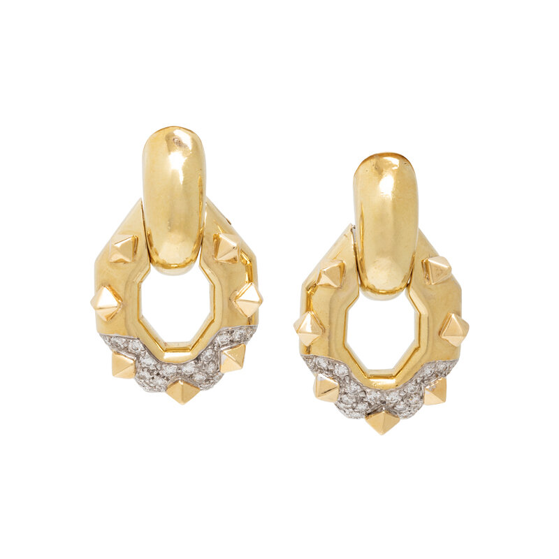 Of door-knocker style set with round diamonds and gold studs. Mounted in yellow and white gold. 1 1/2 inches long.