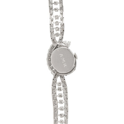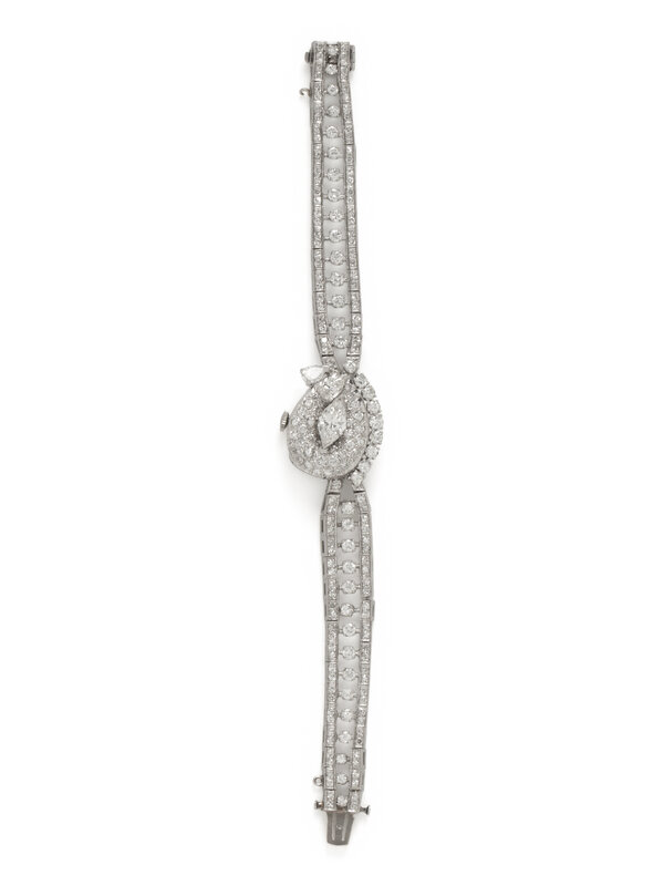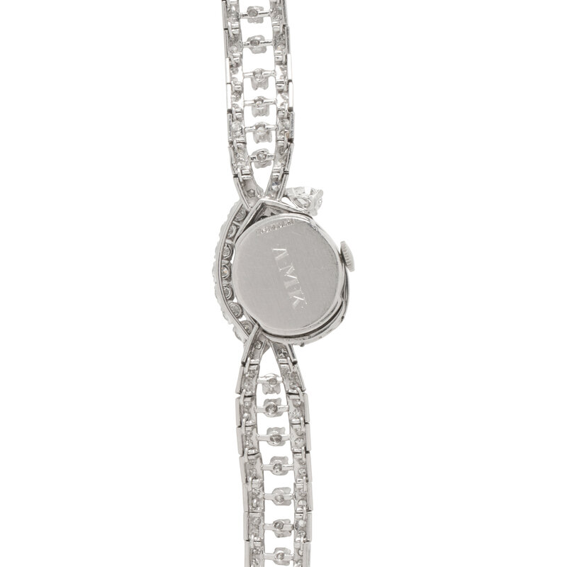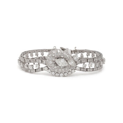 Designed with a hidden dial featuring a prominent marquise cut diamond weighing approximately 1.00 carat, the oval case measuring approximately 18 x 16 mm with a white dial and manual wind movement, on an integrated platinum bracelet set throughout with pear shape, round, and single cut diamonds weighing approximately 4.50 carats total. Mounted in platinum. 6 3/8 inches long.