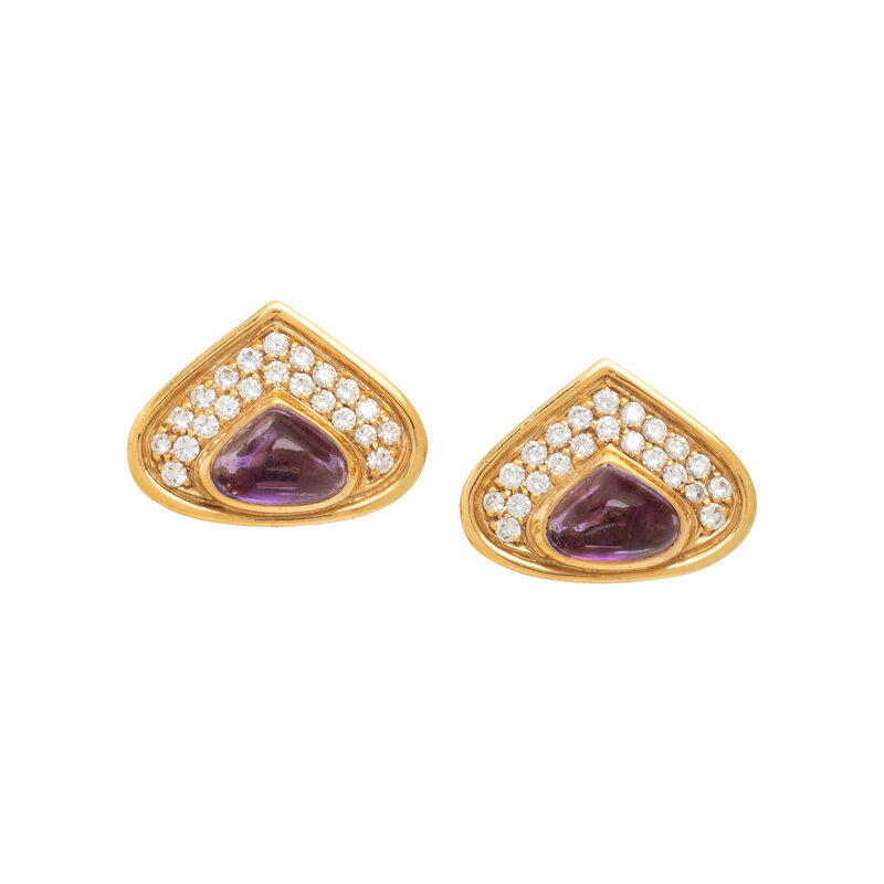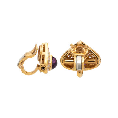 Set with amethyst cabochons measuring approximately 9.00 x 6.35 mm and round diamonds weighing approximately 0.60 carat total. Mounted in 18 karat yellow gold. 5/8 inch long.
