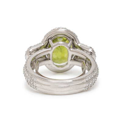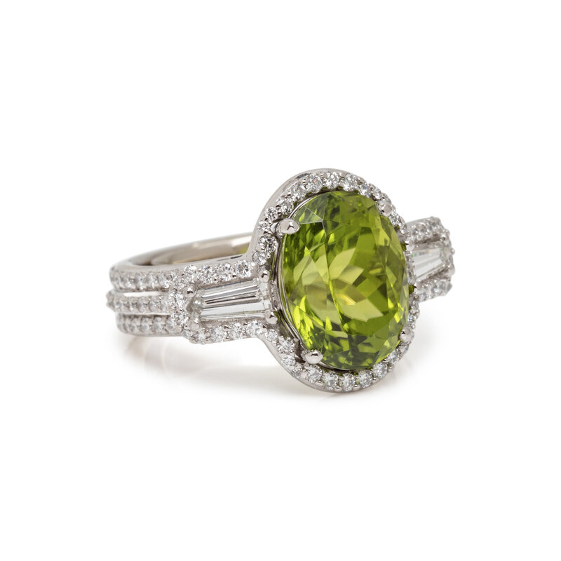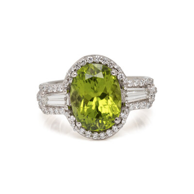 Set with an oval cut peridot weighing 6.28 carats, with round and bullet cut diamonds weighing approximately 2.00 carats total. Mounted in platinum. Ring size 6.