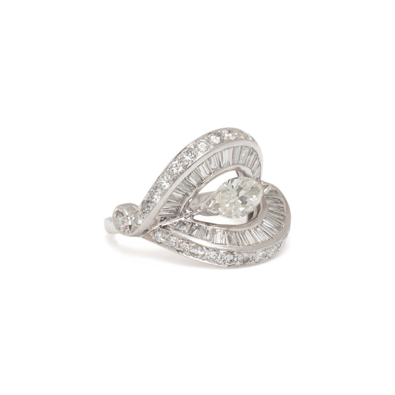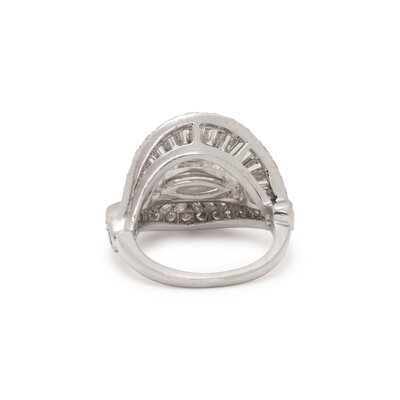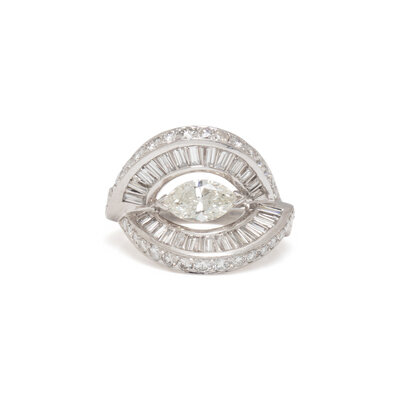 Centering a marquise cut diamond weighing approximately 0.75 carat, surrounded by round and baguette diamonds weighing approximately 2.10 carats total. Mounted in platinum. Ring size 5.