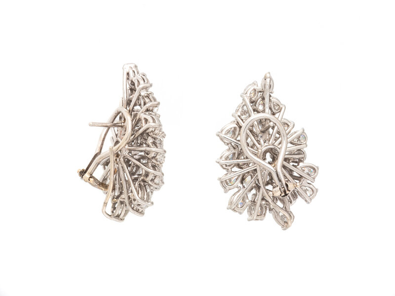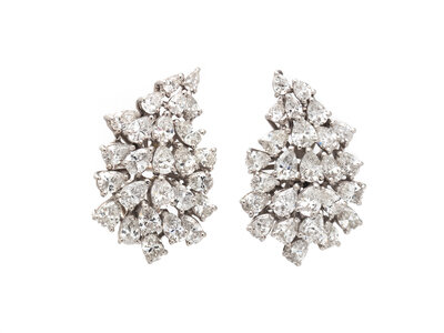 Set with graduating pear shaped diamonds weighing approximately 9.00 - 10.00 carats total. Mounted in platinum with white gold clip backs. 1 1/4 inches long.