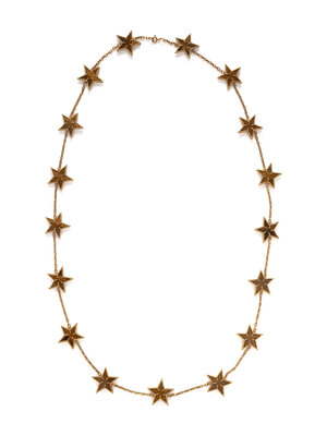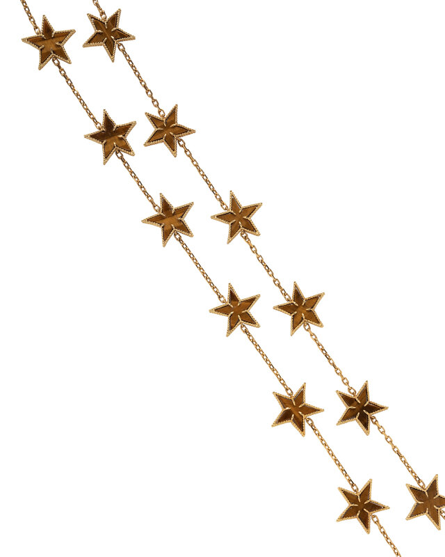 Seventeen star-shaped tiger's eye stations joined by the gold fine link chain. 18 karat yellow gold. 34 1/2 inches long.