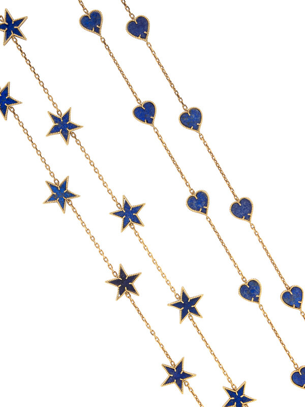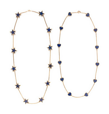 One designed with stations containing heart-shaped lapis lazuli tablets, the other with stars. Mounted in yellow gold. Heart necklace: 32 1/4 inches long. Star necklace: 34 inches long.