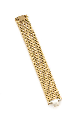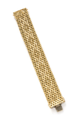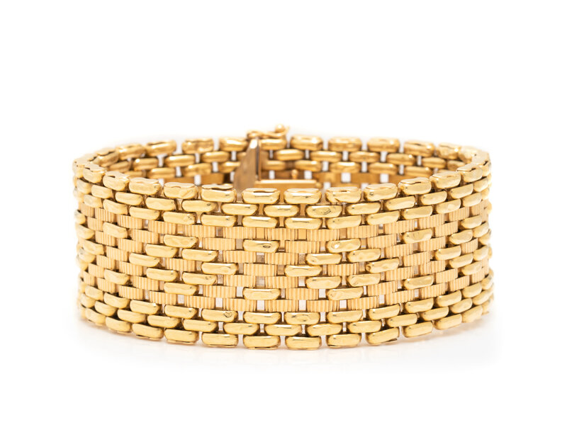 Textured and polished brick links in a geometric pattern. Mounted in 18 karat yellow gold. 7 1/4 inches long, 1 inch wide.