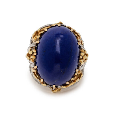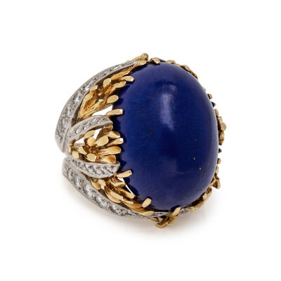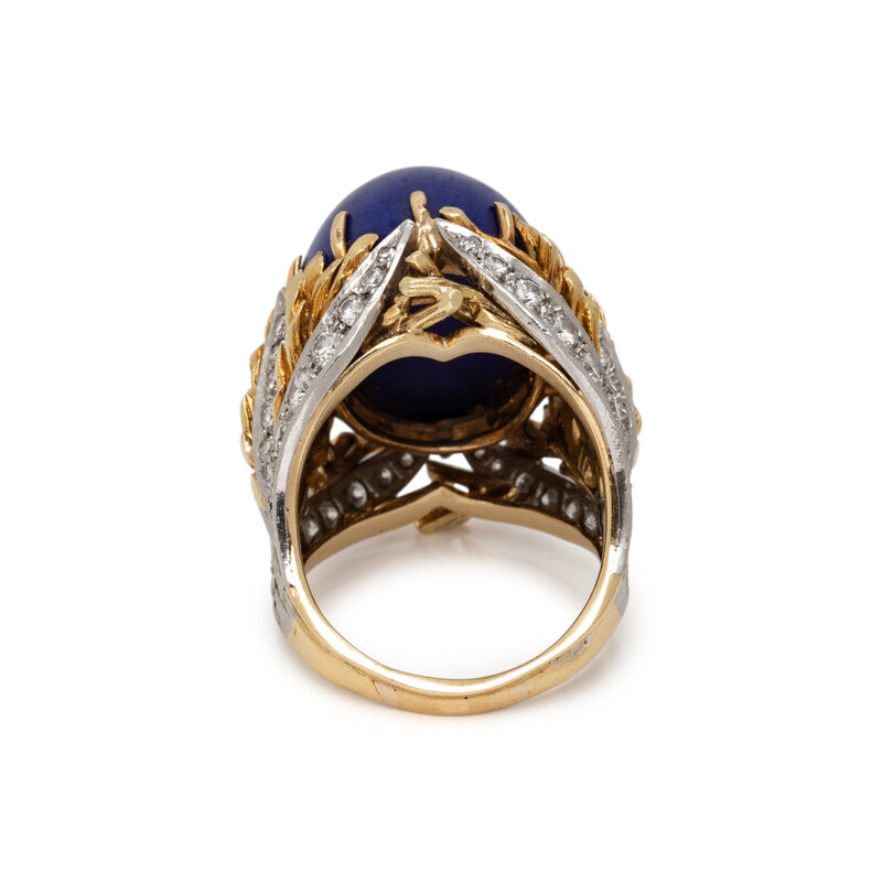 Set with an oval cabochon lapis lazuli measuring approximately 22.60 x 16.80 x 9.50 mm in a sculptural yellow gold and platinum mounting set with round diamonds. Ring size 7 3/4.