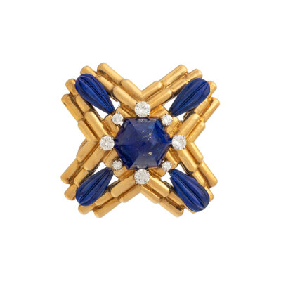 Set with carved lapis lazuli in a geometric design, with round diamonds at the center weighing approximately 1.85 carats total. Mounted in 18 karat yellow gold. 2 1/8 x 2 1/8 inches.