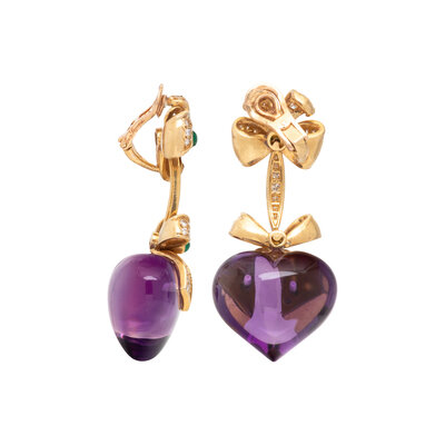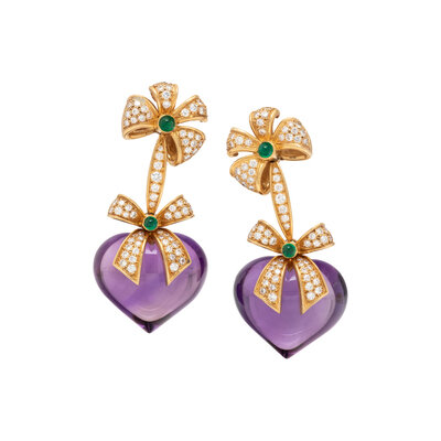 Featuring carved amethyst hearts measuring approximately 25.00 x 23.00 x 16.00 mm, suspended from yellow gold bows pavé set with round diamonds weighing approximately 2.50 carats total, and round cabochon emerald accents. 18 karat yellow gold. 2 1/8 inches long.