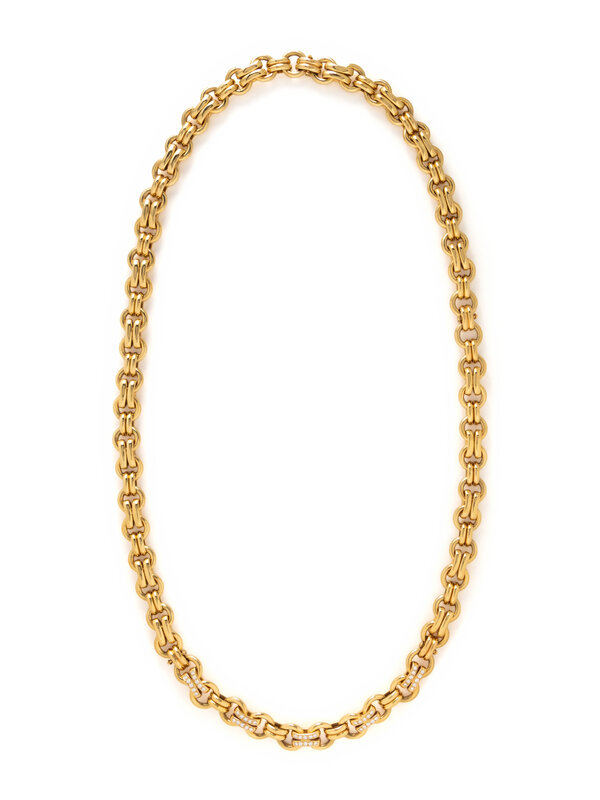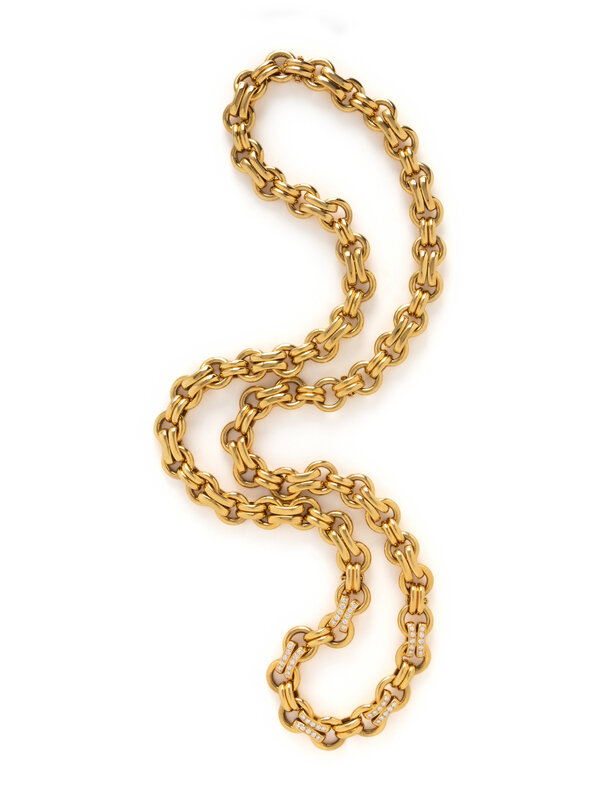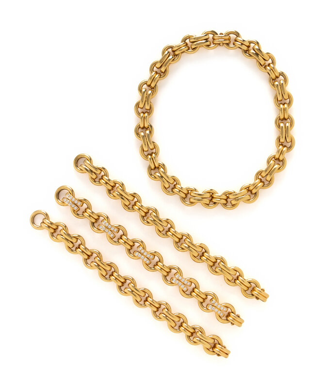 A convertible jewelry set including one necklace and three bracelets, all of which can be clasped together to form a long chain or varying lengths of chain, one of the bracelets featuring five links set with round diamonds weighing approximately 2.25 carats total. 18 karat yellow gold. Bracelets: 7 1/4, 7 5/8, and 7 3/4 inches long. Necklace: 16 inches long.