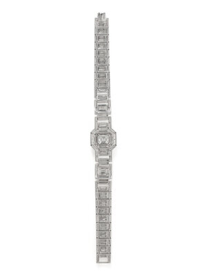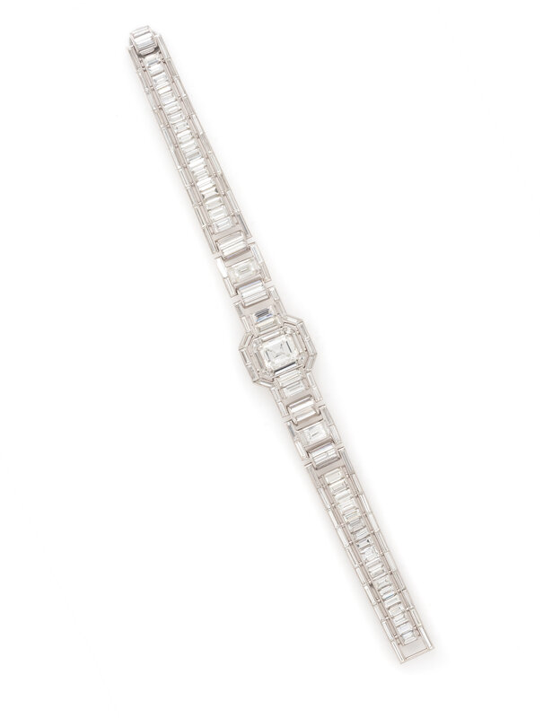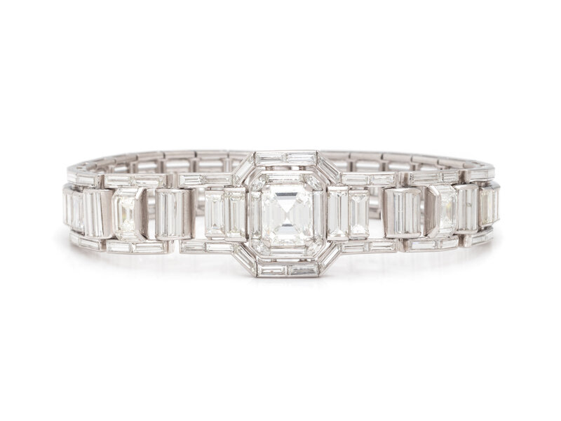 Centering an emerald cut diamond weighing 2.36 carats, with baguette, emerald, and marquise cut diamonds set throughout weighing approximately 18.00 carats total. Mounted in platinum. 6 3/4 inches long.